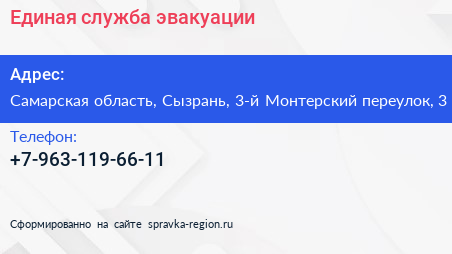Единая служба эвакуации по адресу Самарская область, Сызрань, 3-й Монтерский переулок, 3 в дальнейшем Организация, размещена в следующих категориях: