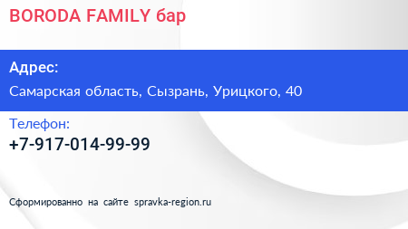 BORODA FAMILY, бар по адресу Самарская область, Сызрань, Урицкого, 40 в дальнейшем Организация, размещена в следующих категориях: