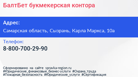 БалтБет, букмекерская контора по адресу Самарская область, Сызрань, Карла Маркса, 10а в дальнейшем Организация, размещена в следующих категориях: