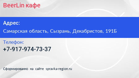 BeerLin, кафе по адресу Самарская область, Сызрань, Декабристов, 191Б в дальнейшем Организация, размещена в следующих категориях: