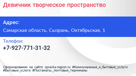Девичник, творческое пространство по адресу Самарская область, Сызрань, Октябрьская, 1 в дальнейшем Организация, размещена в следующих категориях: