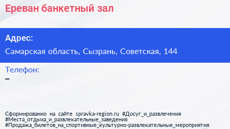 Ереван, банкетный зал по адресу Самарская область, Сызрань, Советская, 144 в дальнейшем Организация, размещена в следующих категориях: