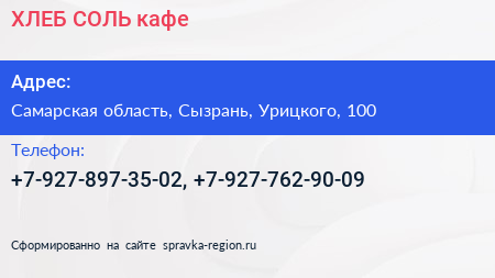 ХЛЕБ СОЛЬ, кафе по адресу Самарская область, Сызрань, Урицкого, 100 в дальнейшем Организация, размещена в следующих категориях: