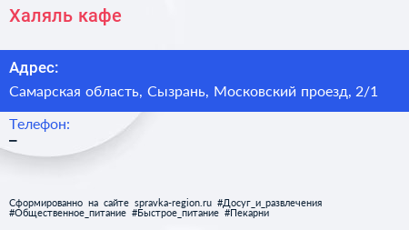 Халяль, кафе по адресу Самарская область, Сызрань, Московский проезд, 2/1 в дальнейшем Организация, размещена в следующих категориях:
