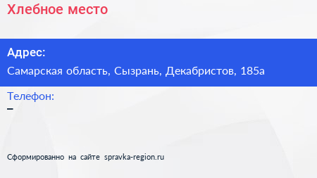 Хлебное место по адресу Самарская область, Сызрань, Декабристов, 185а в дальнейшем Организация, размещена в следующих категориях: