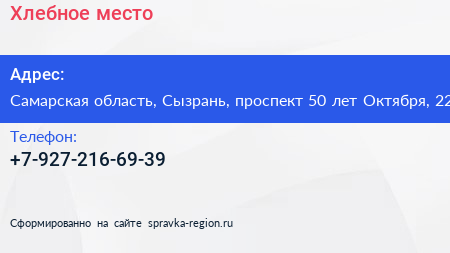 Хлебное место по адресу Самарская область, Сызрань, проспект 50 лет Октября, 22 в дальнейшем Организация, размещена в следующих категориях: