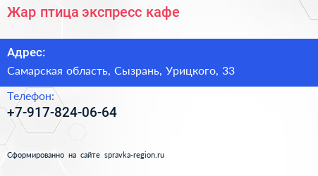 Жар-птица, экспресс-кафе по адресу Самарская область, Сызрань, Урицкого, 33 в дальнейшем Организация, размещена в следующих категориях: