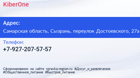 KiberOne по адресу Самарская область, Сызрань, переулок Достоевского, 27а в дальнейшем Организация, размещена в следующих категориях: