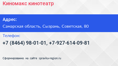 Киномакс, кинотеатр по адресу Самарская область, Сызрань, Советская, 80 в дальнейшем Организация, размещена в следующих категориях: