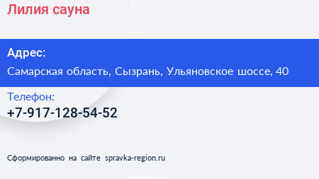 Лилия, сауна по адресу Самарская область, Сызрань, Ульяновское шоссе, 40 в дальнейшем Организация, размещена в следующих категориях: