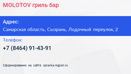 MOLOTOV, гриль-бар по адресу Самарская область, Сызрань, Лодочный переулок, 2 в дальнейшем Организация, размещена в следующих категориях: