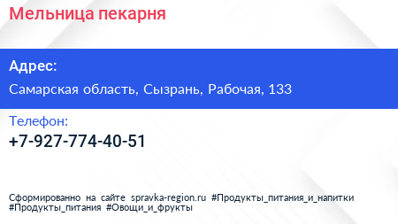 Мельница, пекарня по адресу Самарская область, Сызрань, Рабочая, 133 в дальнейшем Организация, размещена в следующих категориях: