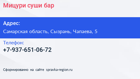 Мицури, суши-бар по адресу Самарская область, Сызрань, Чапаева, 5 в дальнейшем Организация, размещена в следующих категориях: