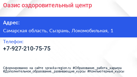 Оазис, оздоровительный центр по адресу Самарская область, Сызрань, Локомобильная, 1 в дальнейшем Организация, размещена в следующих категориях: