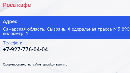 Роса, кафе по адресу Самарская область, Сызрань, Федеральная трасса М5 890 километр, 1 в дальнейшем Организация, размещена в следующих категориях: