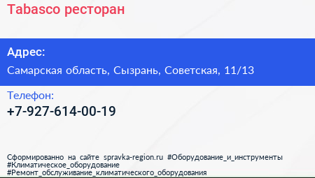 Tabasco, ресторан по адресу Самарская область, Сызрань, Советская, 11/13 в дальнейшем Организация, размещена в следующих категориях: