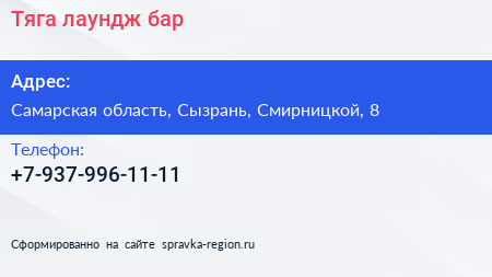 Тяга, лаундж-бар по адресу Самарская область, Сызрань, Смирницкой, 8 в дальнейшем Организация, размещена в следующих категориях: