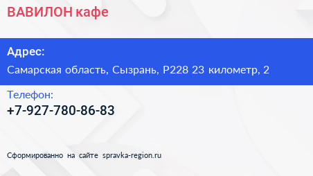 ВАВИЛОН, кафе по адресу Самарская область, Сызрань, Р228 23 километр, 2 в дальнейшем Организация, размещена в следующих категориях: