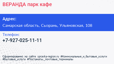 ВЕРАНДА, парк-кафе по адресу Самарская область, Сызрань, Ульяновская, 108 в дальнейшем Организация, размещена в следующих категориях: