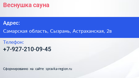 Веснушка, сауна по адресу Самарская область, Сызрань, Астраханская, 2в в дальнейшем Организация, размещена в следующих категориях: