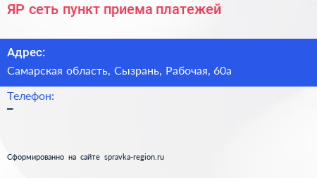 ЯР сеть, пункт приема платежей по адресу Самарская область, Сызрань, Рабочая, 60а в дальнейшем Организация, размещена в следующих категориях: