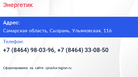 Энергетик по адресу Самарская область, Сызрань, Ульяновская, 116 в дальнейшем Организация, размещена в следующих категориях: