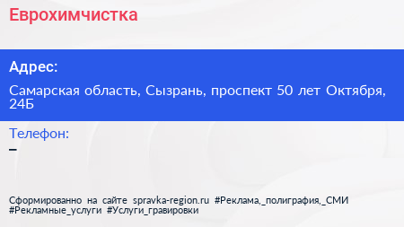 Еврохимчистка по адресу Самарская область, Сызрань, проспект 50 лет Октября, 24Б в дальнейшем Организация, размещена в следующих категориях: