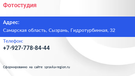 Фотостудия по адресу Самарская область, Сызрань, Гидротурбинная, 32 в дальнейшем Организация, размещена в следующих категориях: