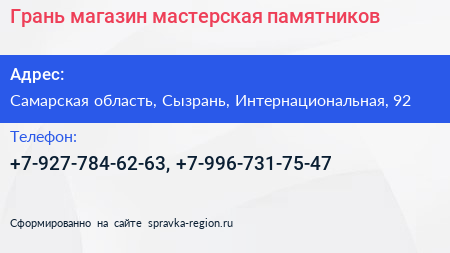 Грань, магазин-мастерская памятников по адресу Самарская область, Сызрань, Интернациональная, 92 в дальнейшем Организация, размещена в следующих категориях: