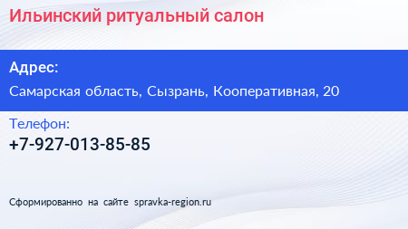 Ильинский, ритуальный салон по адресу Самарская область, Сызрань, Кооперативная, 20 в дальнейшем Организация, размещена в следующих категориях: