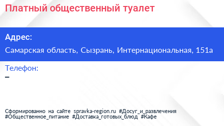 Платный общественный туалет по адресу Самарская область, Сызрань, Интернациональная, 151а в дальнейшем Организация, размещена в следующих категориях: