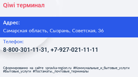 Qiwi, терминал по адресу Самарская область, Сызрань, Советская, 36 в дальнейшем Организация, размещена в следующих категориях:
