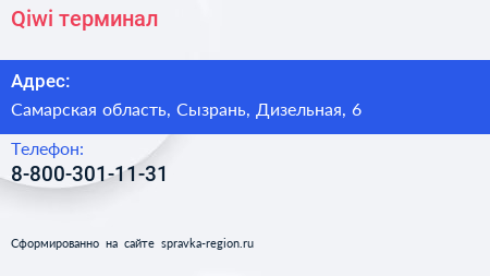 Qiwi, терминал по адресу Самарская область, Сызрань, Дизельная, 6 в дальнейшем Организация, размещена в следующих категориях:
