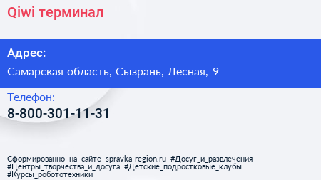 Qiwi, терминал по адресу Самарская область, Сызрань, Лесная, 9 в дальнейшем Организация, размещена в следующих категориях: