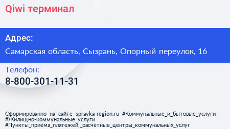 Qiwi, терминал по адресу Самарская область, Сызрань, Опорный переулок, 16 в дальнейшем Организация, размещена в следующих категориях: