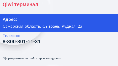 Qiwi, терминал по адресу Самарская область, Сызрань, Рудная, 2а в дальнейшем Организация, размещена в следующих категориях: