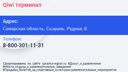 Qiwi, терминал по адресу Самарская область, Сызрань, Рудная, 8 в дальнейшем Организация, размещена в следующих категориях: