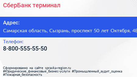 СберБанк, терминал по адресу Самарская область, Сызрань, проспект 50 лет Октября, 4Б в дальнейшем Организация, размещена в следующих категориях: