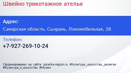 Швейно-трикотажное ателье по адресу Самарская область, Сызрань, Локомобильная, 28 в дальнейшем Организация, размещена в следующих категориях: