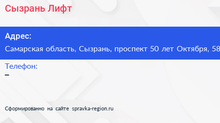 Сызрань-Лифт по адресу Самарская область, Сызрань, проспект 50 лет Октября, 58 в дальнейшем Организация, размещена в следующих категориях: