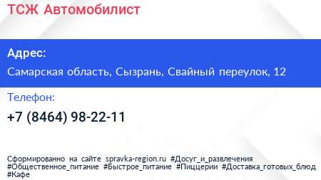 ТСЖ Автомобилист по адресу Самарская область, Сызрань, Свайный переулок, 12 в дальнейшем Организация, размещена в следующих категориях: