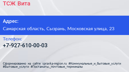 ТСЖ Вита по адресу Самарская область, Сызрань, Московская улица, 23 в дальнейшем Организация, размещена в следующих категориях: