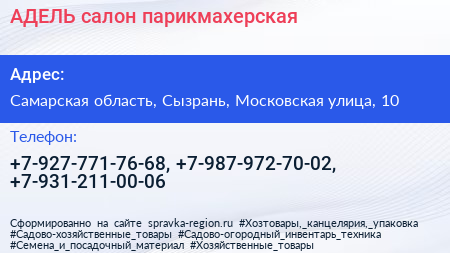 АДЕЛЬ, салон-парикмахерская по адресу Самарская область, Сызрань, Московская улица, 10 в дальнейшем Организация, размещена в следующих категориях: