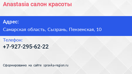 Anastasia, салон красоты по адресу Самарская область, Сызрань, Пензенская, 10 в дальнейшем Организация, размещена в следующих категориях: