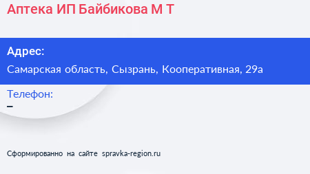 Аптека, ИП Байбикова М.Т. по адресу Самарская область, Сызрань, Кооперативная, 29а в дальнейшем Организация, размещена в следующих категориях: