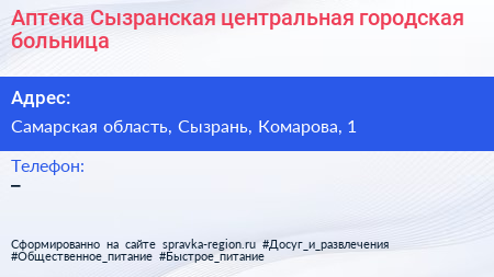 Аптека, Сызранская центральная городская больница по адресу Самарская область, Сызрань, Комарова, 1 в дальнейшем Организация, размещена в следующих категориях: