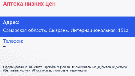 Аптека низких цен по адресу Самарская область, Сызрань, Интернациональная, 151а в дальнейшем Организация, размещена в следующих категориях: