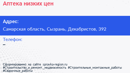 Аптека низких цен по адресу Самарская область, Сызрань, Декабристов, 392 в дальнейшем Организация, размещена в следующих категориях: