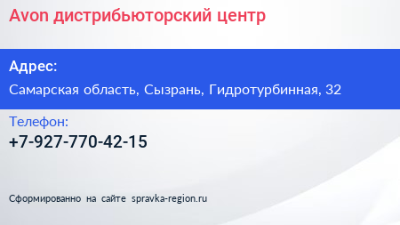 Avon, дистрибьюторский центр по адресу Самарская область, Сызрань, Гидротурбинная, 32 в дальнейшем Организация, размещена в следующих категориях: