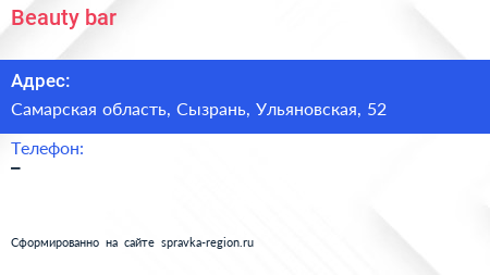 Beauty bar по адресу Самарская область, Сызрань, Ульяновская, 52 в дальнейшем Организация, размещена в следующих категориях: